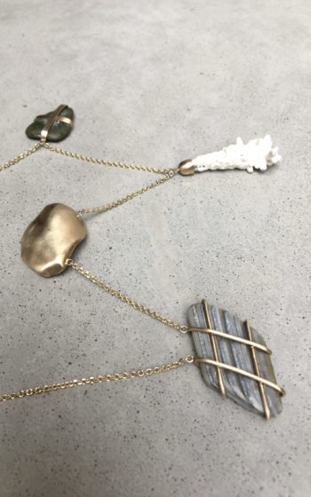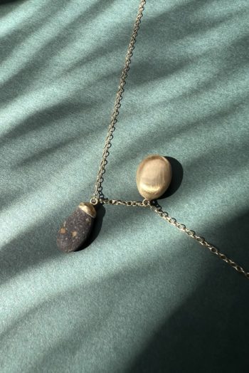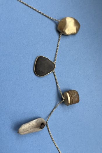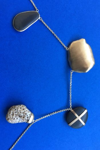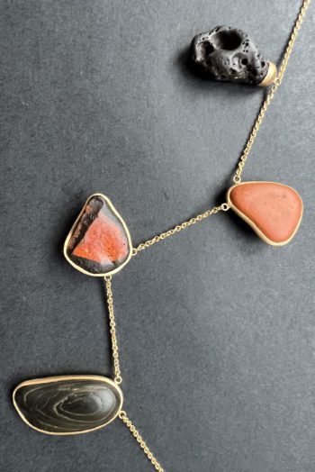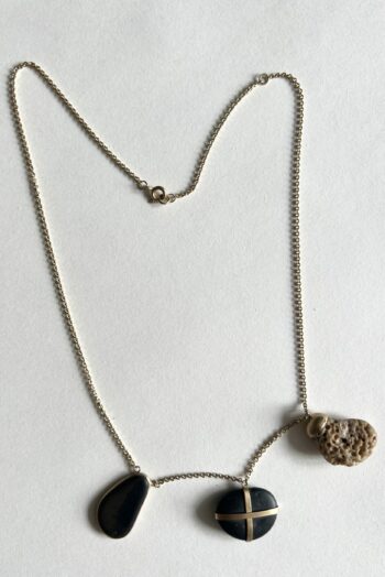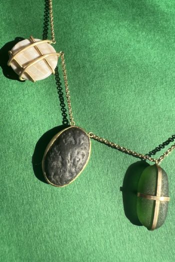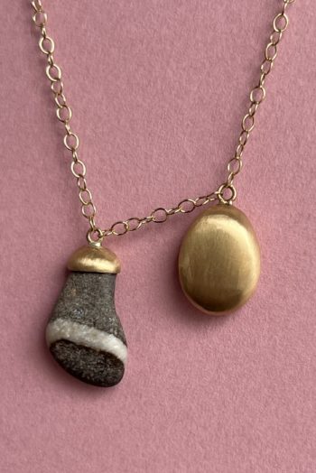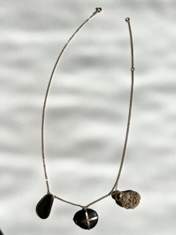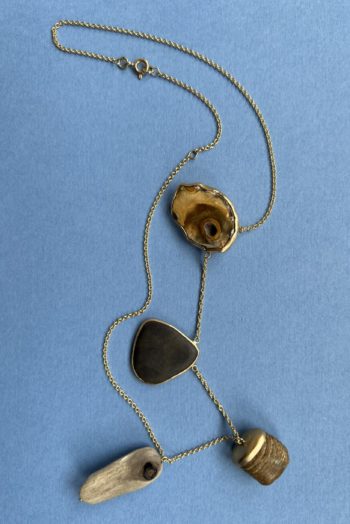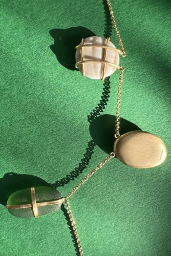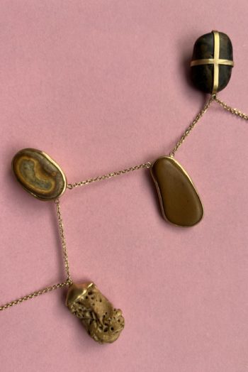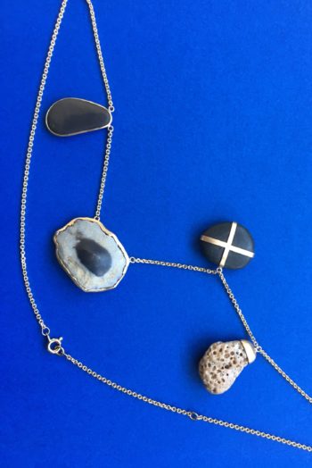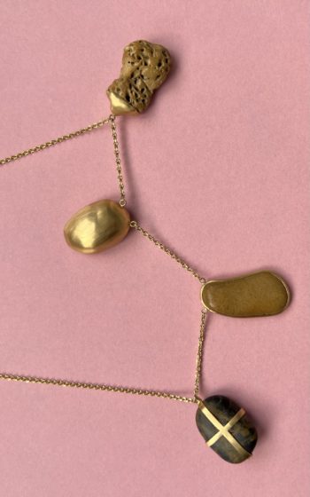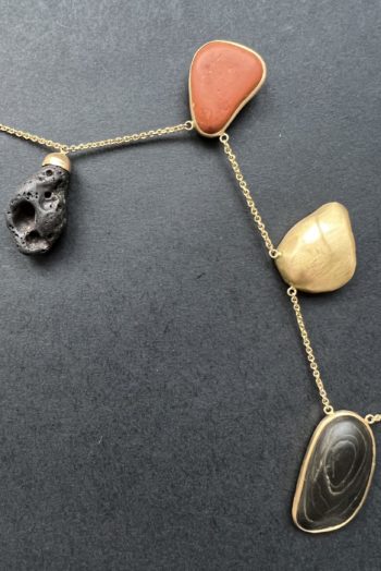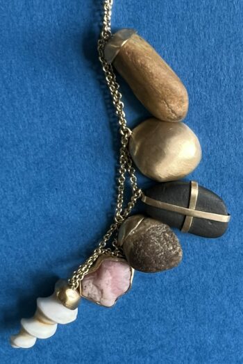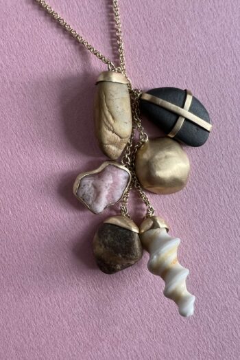 Black oval stone Pink striated shell Twisted ivory shell Olive green greek mediterranean stone Maroon oval sea pebble Set in 9 carat Fairmined gold 45cm 9 carat gold chain, adjustable to 40cm
