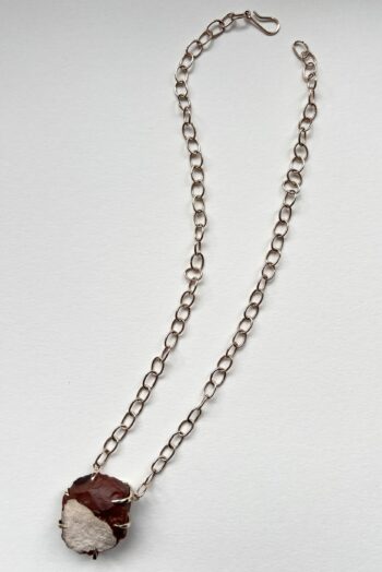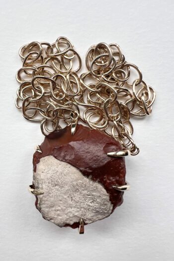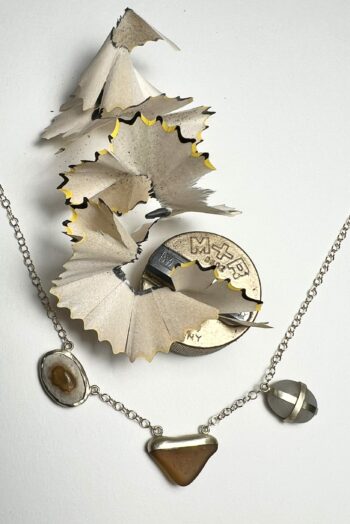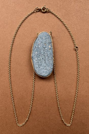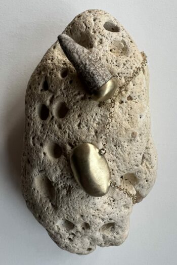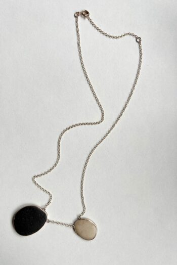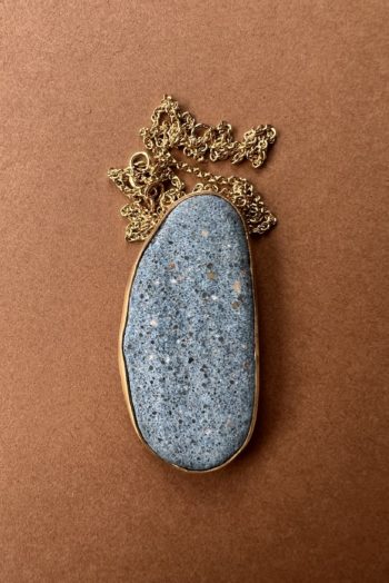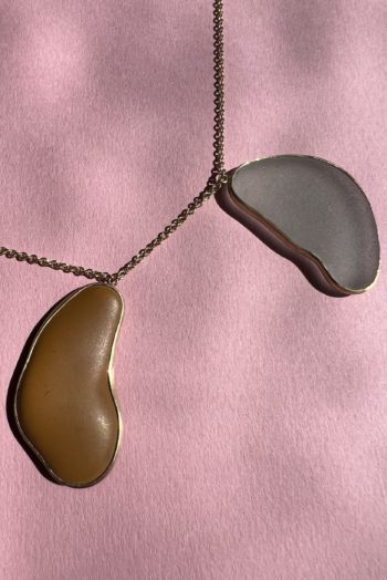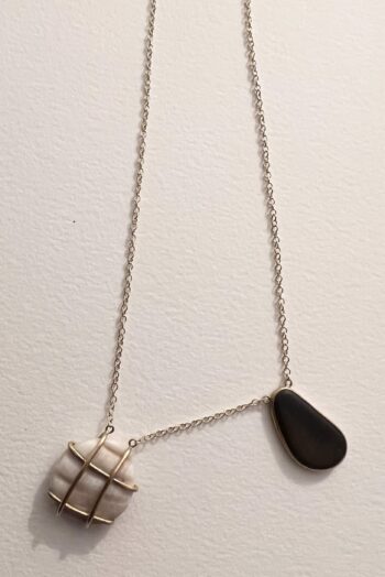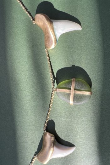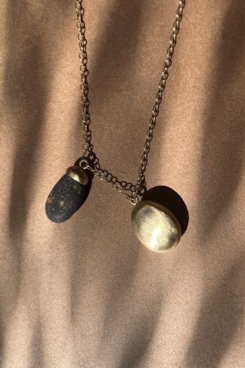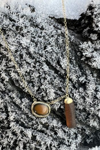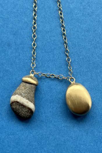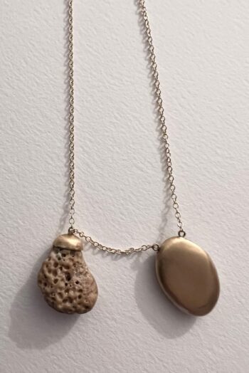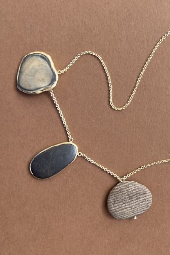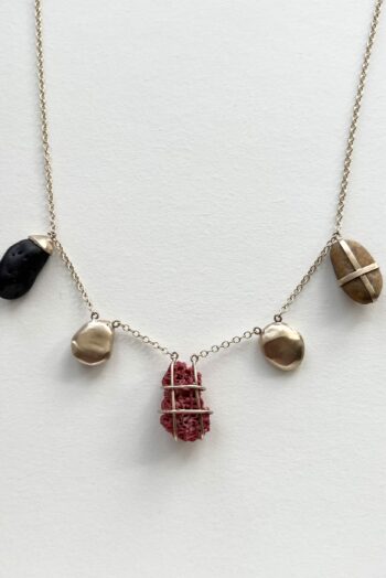 Black oval stone Pink striated shell Twisted ivory shell Olive green greek mediterranean stone Maroon oval sea pebble Set in 9 carat Fairmined gold 45cm 9 carat gold chain, adjustable to 40cm